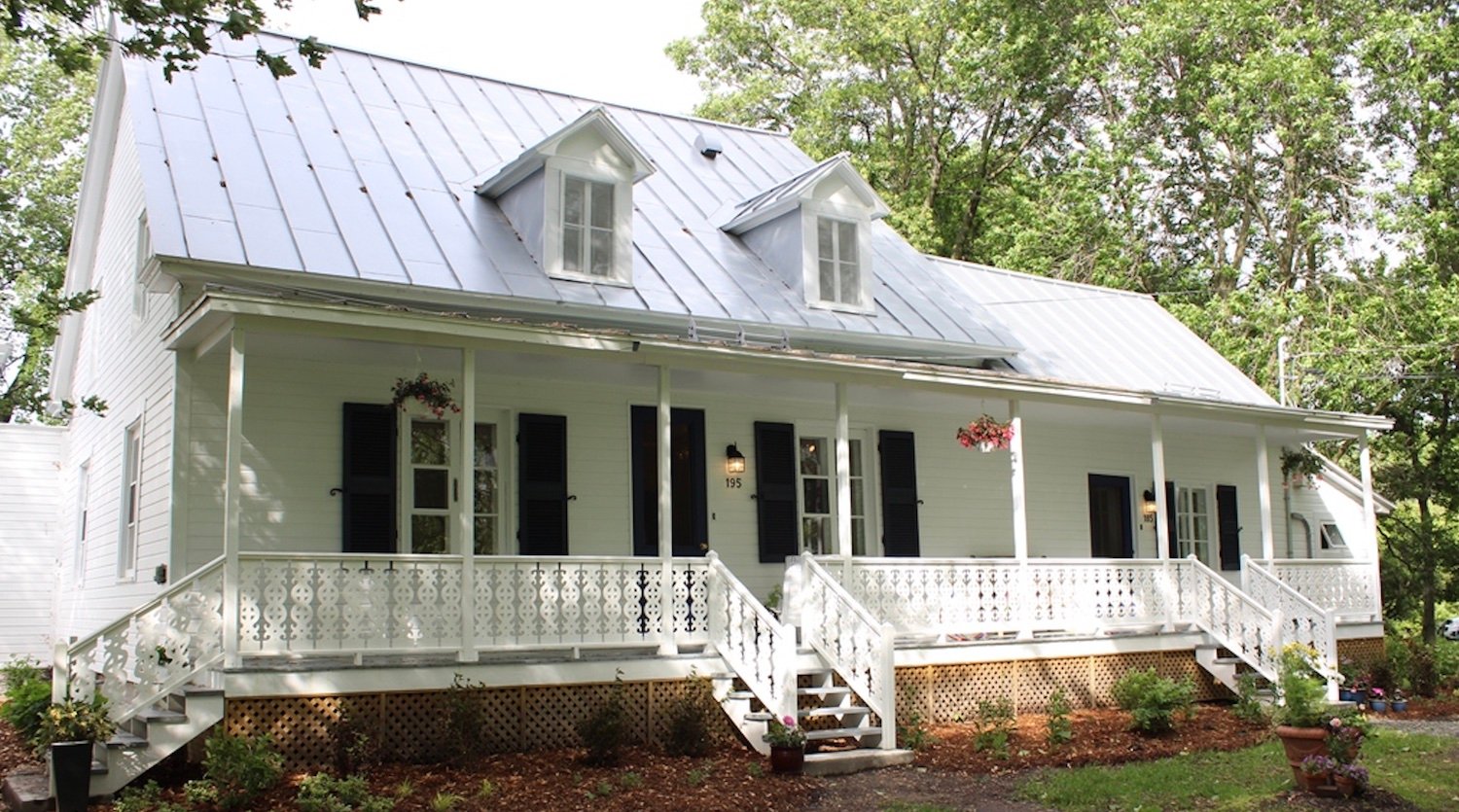 : La maison, de style néoclassique québécois, est en bois, à un étage et demi, avec une galerie couverte de pleine largeur, des lucarnes à pignon et un parement de planches peint en blanc. L’atelier, de style parisien, est cubique, lumineux, avec une grande verrière donnant sur la rivière.