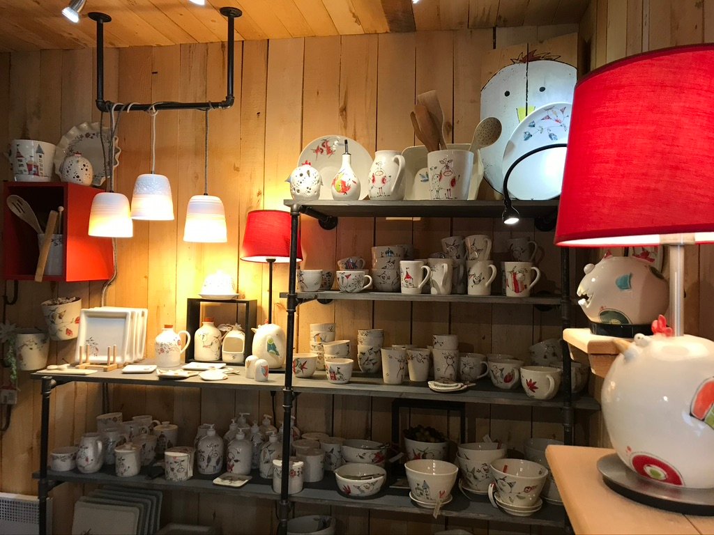 Chaque pièce de poterie est tournée et peinte à la main, rendant chaque objet unique. La boutique en ligne propose une variété d’articles comme des assiettes, bols, verres, beurriers, crémiers, tasses, et des pièces décoratives.
