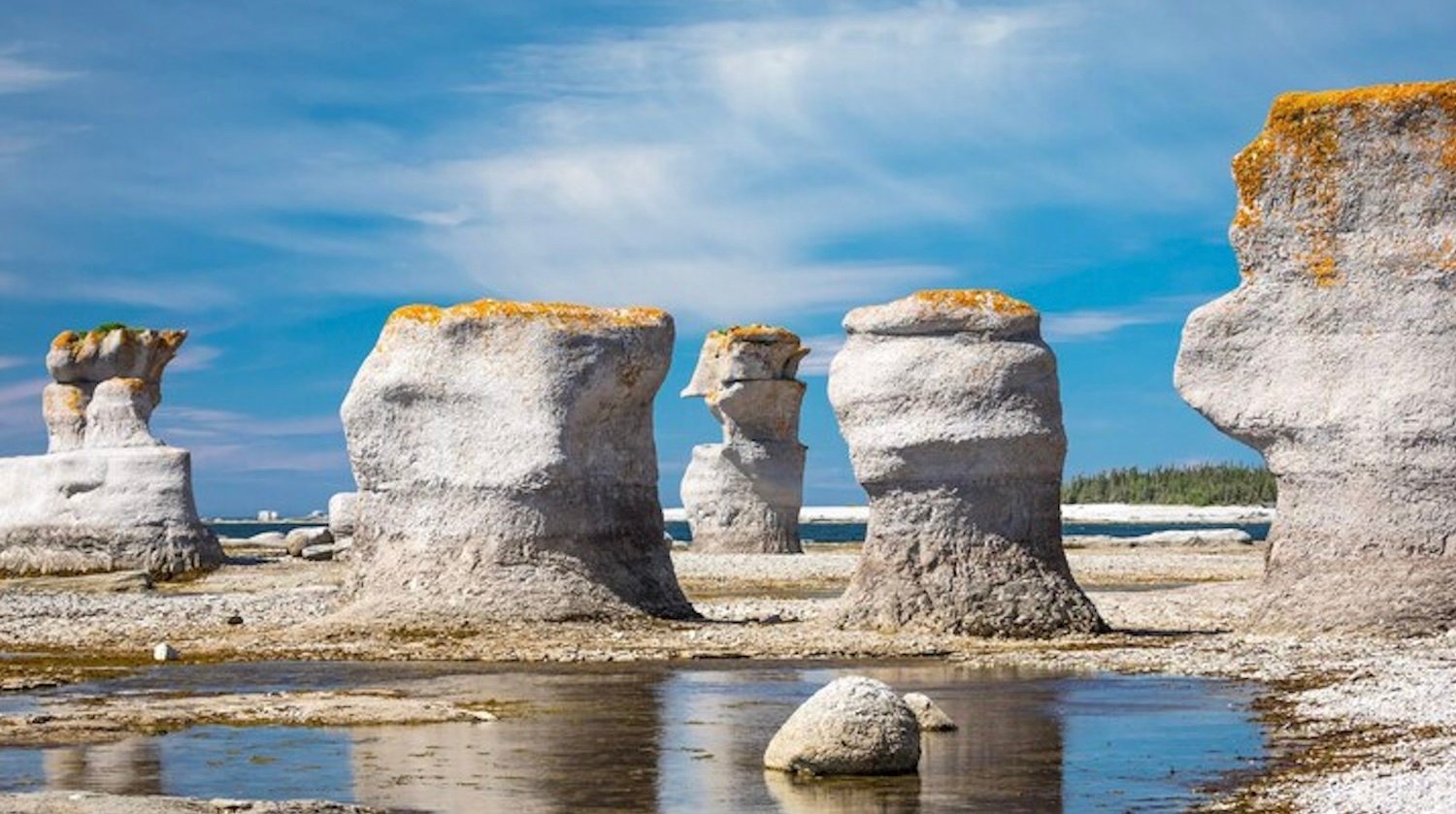 : Les monolithes sont des blocs de calcaire vieux de plus de 450 millions d’années, sculptés par l’érosion due aux vagues, au vent, au gel et au dégel depuis la dernière glaciation. Ils se dressent aujourd’hui comme des géants de pierre aux formes variées, parfois comparées à des animaux, des personnages ou des objets fantastiques.