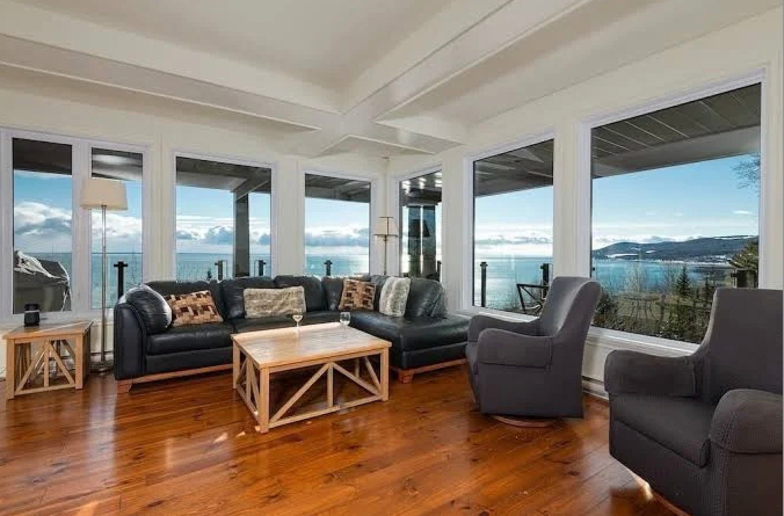 La Villa du Grand Fleuve est un chalet de luxe pour 8 personnes à Saint-Irénée, Charlevoix, avec spa, vue imprenable sur le fleuve, 4 chambres, 2 ½ salles de bain, terrasses, foyer, cuisine complète, Wi-Fi rapide et CITQ : 212203. Animaux non admis