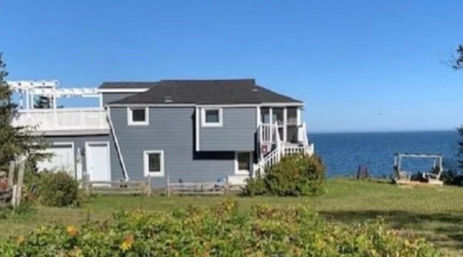 : La maison, construite en 1950 et rénovée, offre environ 2 300 pieds carrés d’espace habitable réparti sur deux niveaux, avec de grandes fenêtres pour profiter de la vue sur l’eau.