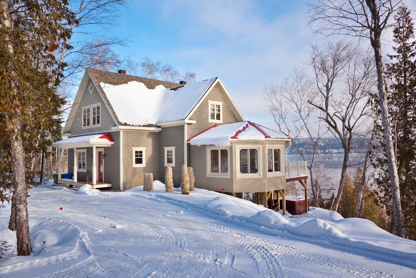La maison est construite à 30 mètres au-dessus du niveau du fleuve (vue panoramique extraordinaire du fleuve, de l’Île-aux-coudres, du Cap-aux-corbeaux et des Éboulements). De la maison, un sentier descend jusqu’au fleuve et donne accès à un boisé faisant partie de la propriété avec 500 pieds de berge directement sur le fleuve. Le site est magnifique!
