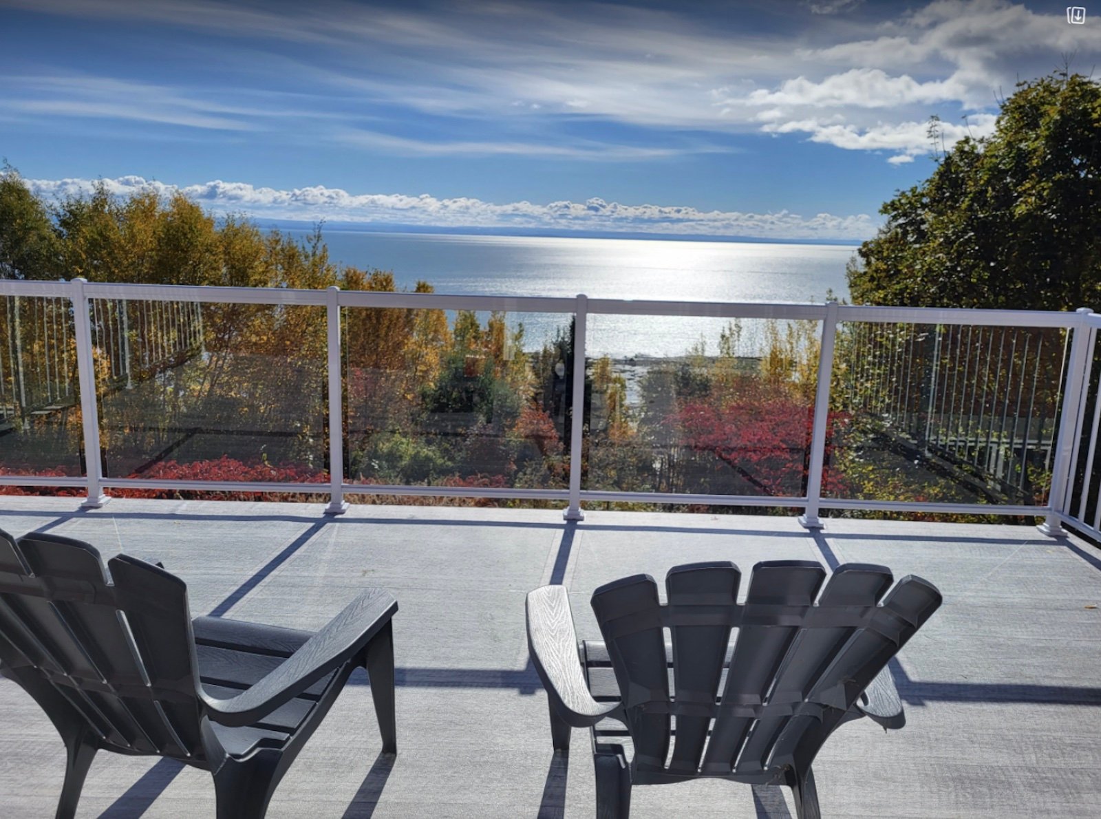 - Vue Panoramique : Le chalet est situé en hauteur, offrant une vue imprenable sur le Fleuve Saint-Laurent et les montagnes environnantes. Les grandes baies vitrées permettent d’admirer le paysage à tout moment de la journée, que ce soit depuis le salon, la cuisine ou les chambres.