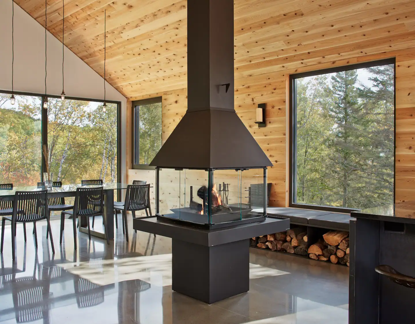 L’étage commun de cette résidence offre un espace convivial et baigné de lumière, grâce à ses nombreuses fenêtres qui dévoilent une vue quasi panoramique sur le paysage environnant et la forêt avoisinante. L’impressionnant plafond cathédrale amplifie la sensation d’ouverture, tandis que le foyer central sert de point focal, unifiant les différentes zones d’activités telles que la lecture, la cuisine, les discussions et les repas.