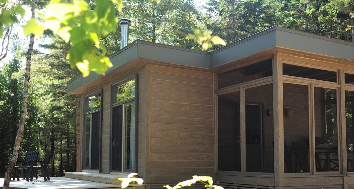 Chalet design de 45 m² en cèdre, galerie avant et véranda grillagée