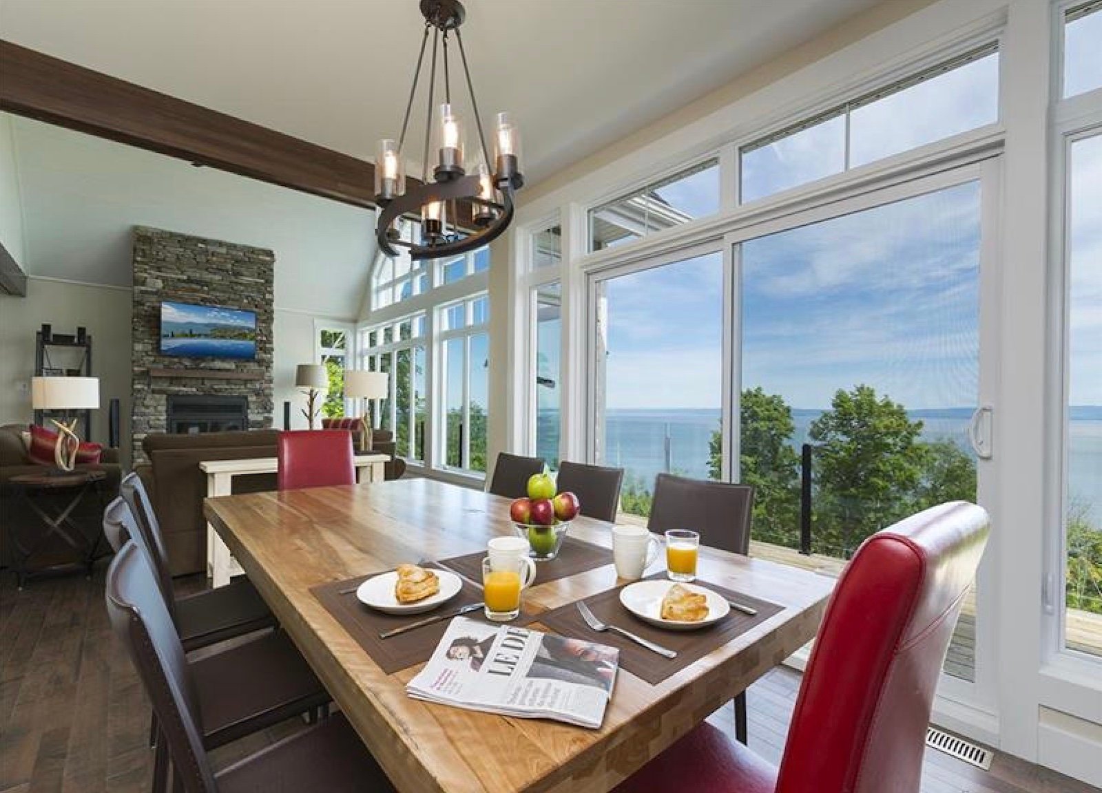 est une résidence de luxe à louer sur l’Isle-aux-Coudres, reconnue pour sa vue panoramique exceptionnelle à 180 degrés sur le fleuve Saint-Laurent, allant de l’île jusqu’au Massif de Charlevoix. Grâce à sa fenestration abondante, elle offre un spectacle naturel impressionnant, que ce soit au lever ou au coucher du soleil.