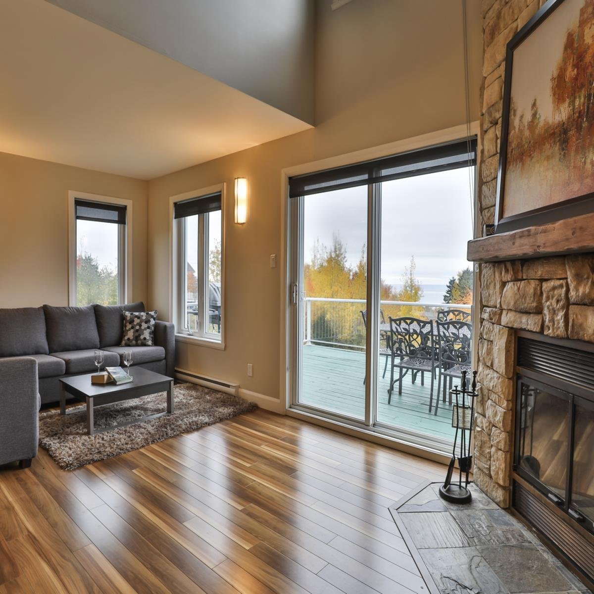 , situé au 3, chemin du Versant, Petite-Rivière-Saint-François, Charlevoix, est un grand condo-chalet jumelé offrant une expérience de séjour confortable et lumineuse avec une vue exceptionnelle sur le fleuve Saint-Laurent et les montagnes du Massif de Charlevoix.