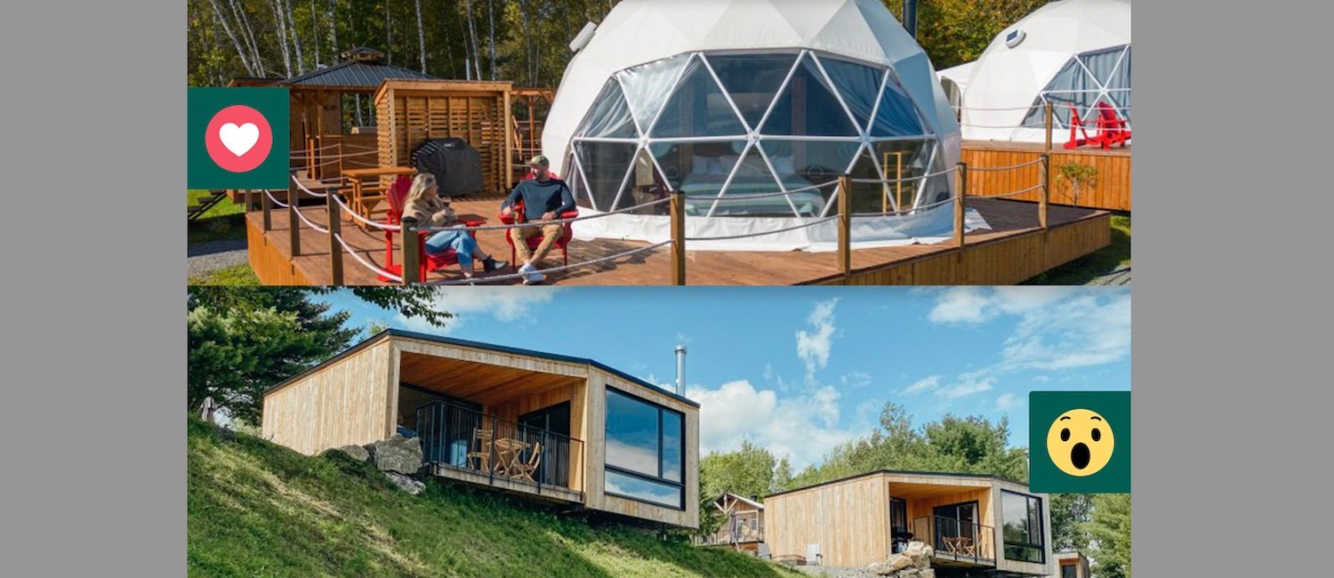 : Dômes géodésiques et mini-chalets.